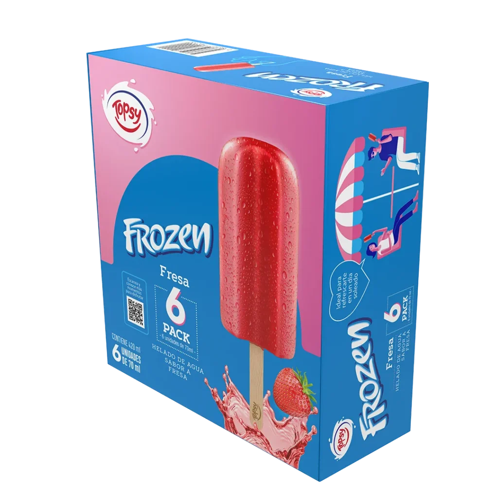 Helado a base de agua ideal para refrescarse por solo 25 centavos, en deliciosos sabores, disfruta Frozen Fresa.