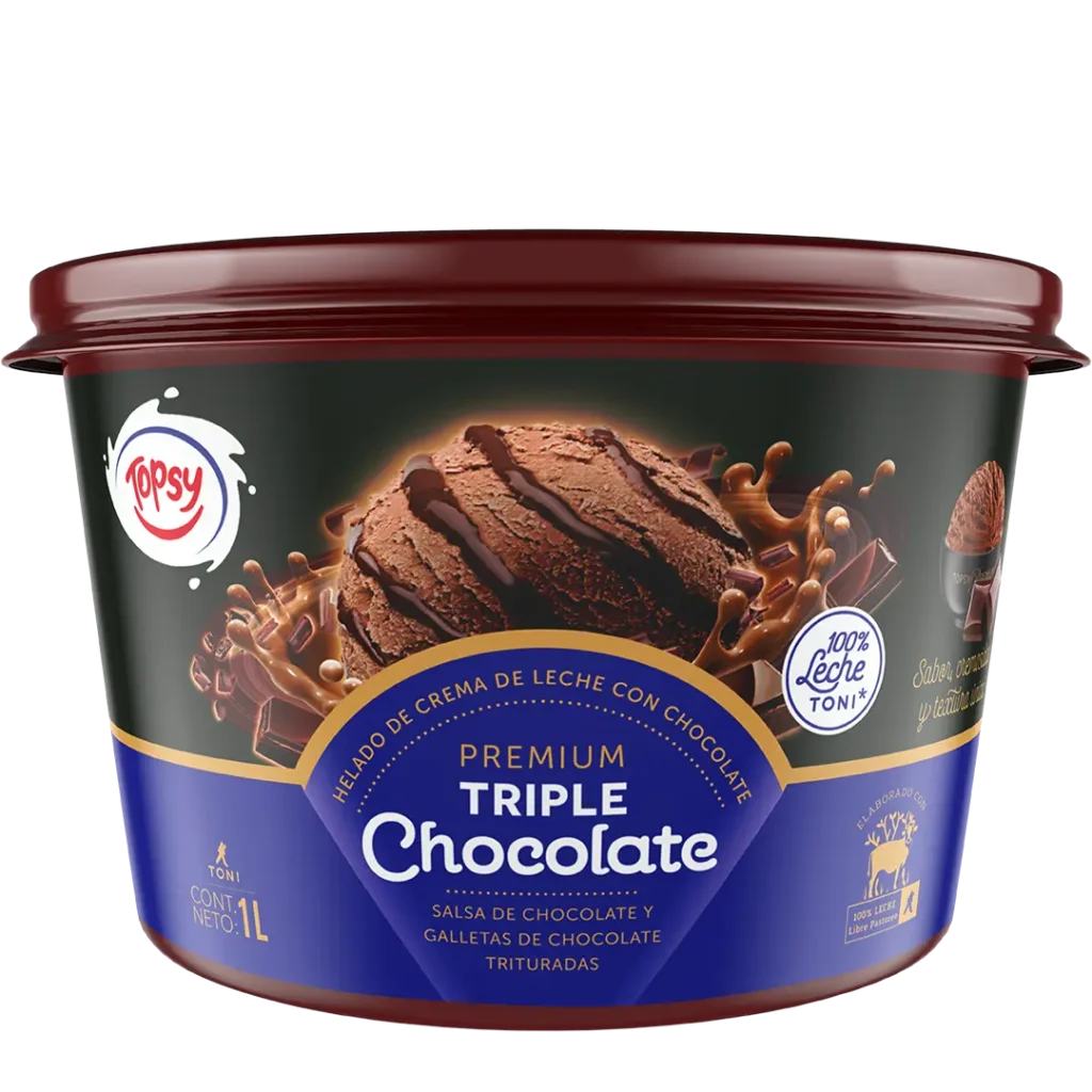 ¡Que bien sabe compartir! Disfruta nuestros litros de helado Topsy con los que más quieres. Cremoso helado con 100% leche Toni y sabor chocolate y jalea de chocolate.